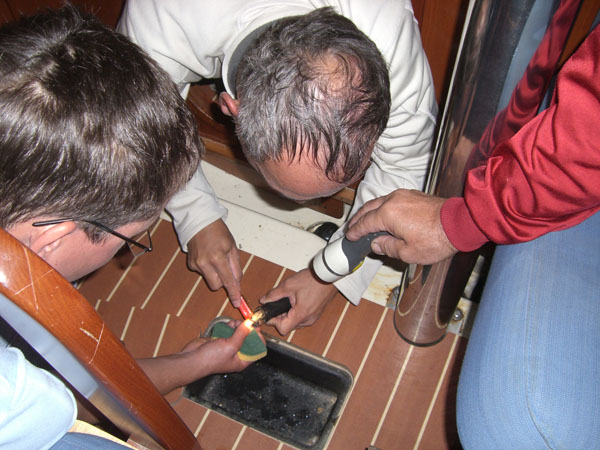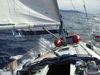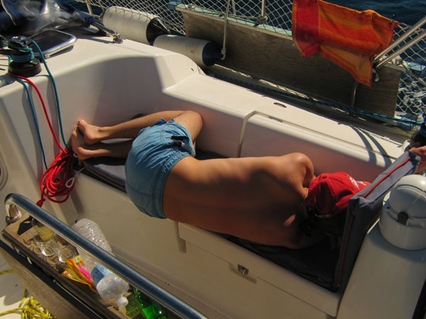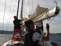 Da das Großfall (das Tau mit dem das Großsegel in den Mast hoch gezogen wird) permanent an den Mast schlug, versuchte ich es zuerst dichter zu holen, allerdings mit mäßigem Erfolg.