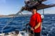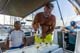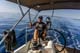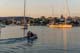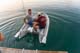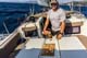 Armin und Martin auf direktem Wege mit dem Dingi auf zum Hafen, um leckeres Frühstück zu besorgen.