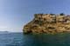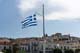 Gleich neben der Turmuhr weht die griechische weiß-blau gestreifte Flagge über einem Fels, der einen sensationellen Blick über die Altstadt, über den schmalen Kanal bis