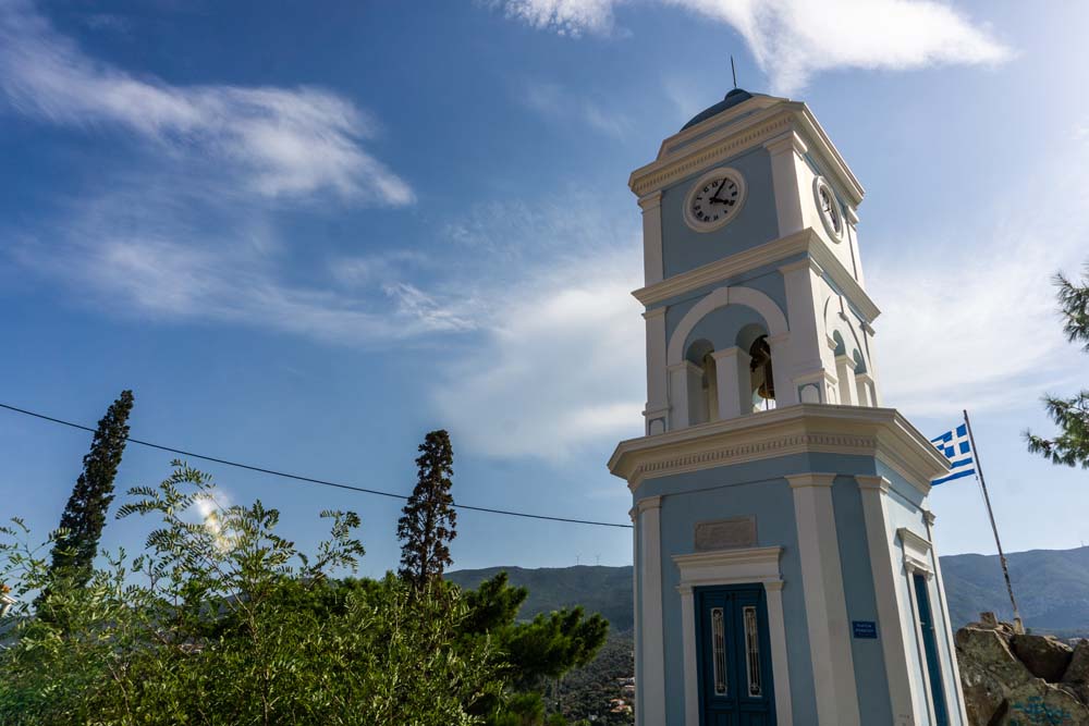 Nach dem Anlegerbier machten wir uns gleich zu der Sehenswürdigkeit von Poros auf, die historische Turmuhr die hoch über dem Ort ragt und bereits seit 1927 tickt.
