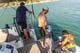 Nur kurze Zeit dümpleten wir vor der Hafeneinfahrt als auch schon Martin und Reno mit den flüssigen Snacks am Heck unseres Bootes festmachten.